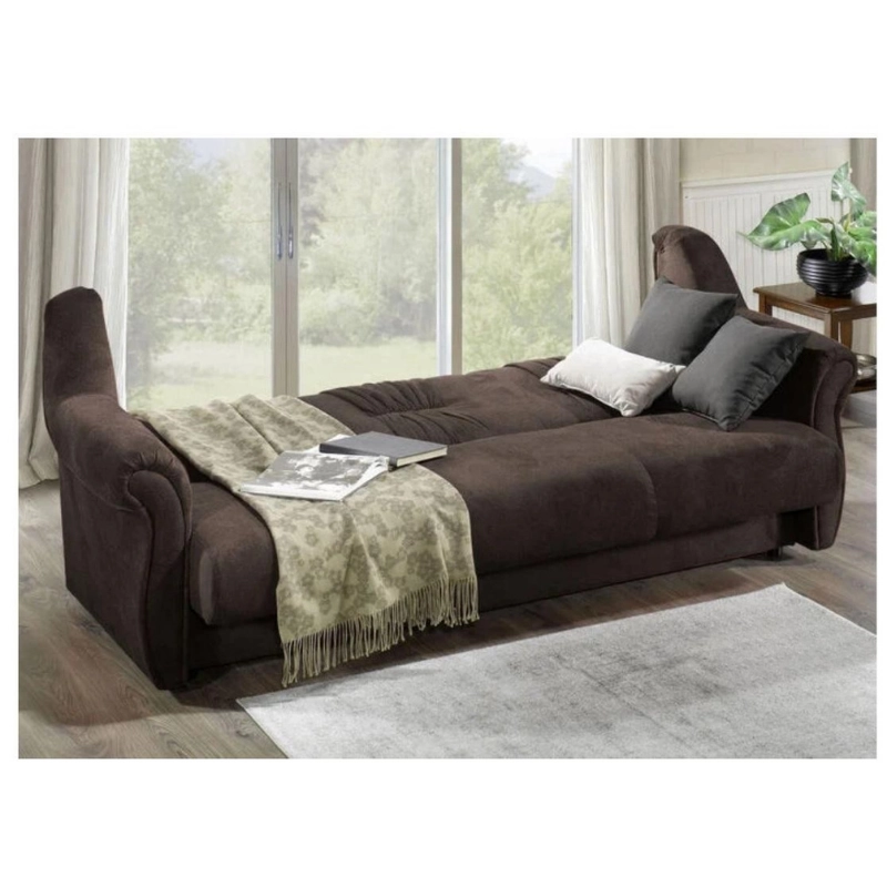 Canapé convertible trois places en tissu marron foncé avec un dossier capitonné pour un confort accru. Ses accoudoirs arrondis lui confèrent un style intemporel.